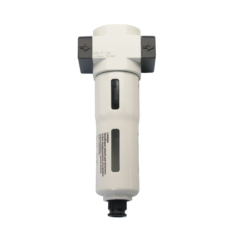 Filtruje sprężone powietrze ze stałych i płynnych cząsteczek i tym samym w dużym stopniu chronią i znacznie przedłużają żywotność pneumatycznych maszyn i urządzeń. Oba przyłącza to gwinty wewnętrzne 1/4 cala. Filtry mogą być zamontowane tylko w pozycji pionowej, w obie strony zgodnie z kierunkiem przepływu powietrza. Filtry Adler Industrial wyposażone są w dokładne wkłady filtrujące sprężone powietrze z cząsteczek większych niż 5 mikronów (5µ).