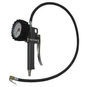 Średnica manometru:60 mm Długość przewodu: 75 cm Wytrzymałość przewodu: 20 bar Skala manometru: 0-12 bar / 0-170 psi Dokładność: 0,1 bar / 2 psi Upuszczanie powietrza: lekkie wciśnięcie spustu Waga: 0,55 kg